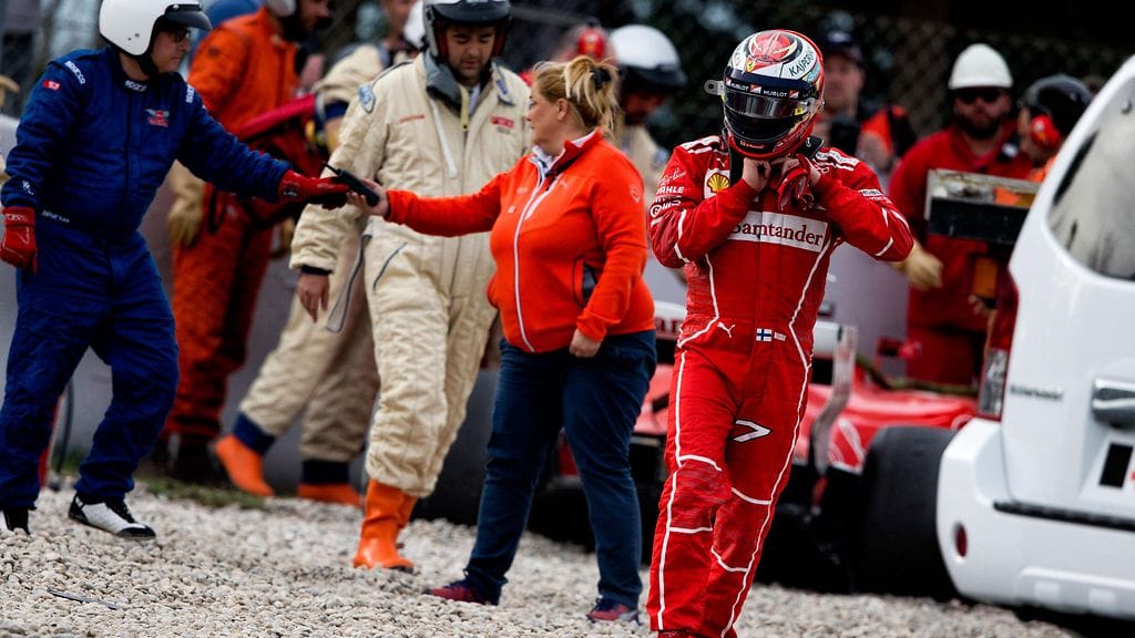 Kimi Räikkönen koki Ferrari-tallin ensimmäisen huonon päivän Barcelonan F1-testeissä. Päivä loppui ratareunukseen.