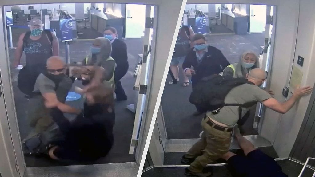 Tilanne tallentui lentokentän valvontakameraan. Miehen aggressiivisen käytöksen tuloksena työntekijä kuljetettiin sairaalaan.