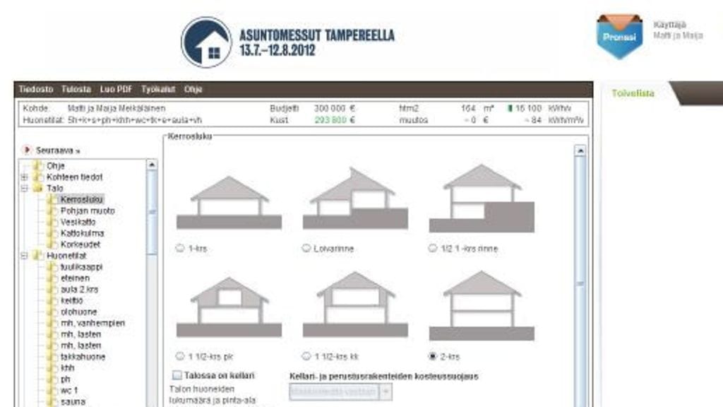 Oma tontti on haussa, sille suunnitellaan puolitoistakerroksista taloa. Netti auki, aloitetaan suunnittelu saman tien. Tarkoitus on rakentaa talo Uudellemaalle, puolitoista kerrosta, neliöitä 150. Budjetti on 300 000 euroa. Sillä tulisi saada keittiö, olohuone, makuuhuone ja lapsille omat huoneet. Ja sauna. Olohuoneeseen reilusti neliöitä, klikataan 30, makuuhuoneissa pärjätään pienemmillä, 12 neliötä. Talopelissä näkee selvästi, miten neliöiden lisääminen nostaa rakentamisen kustannuksia.