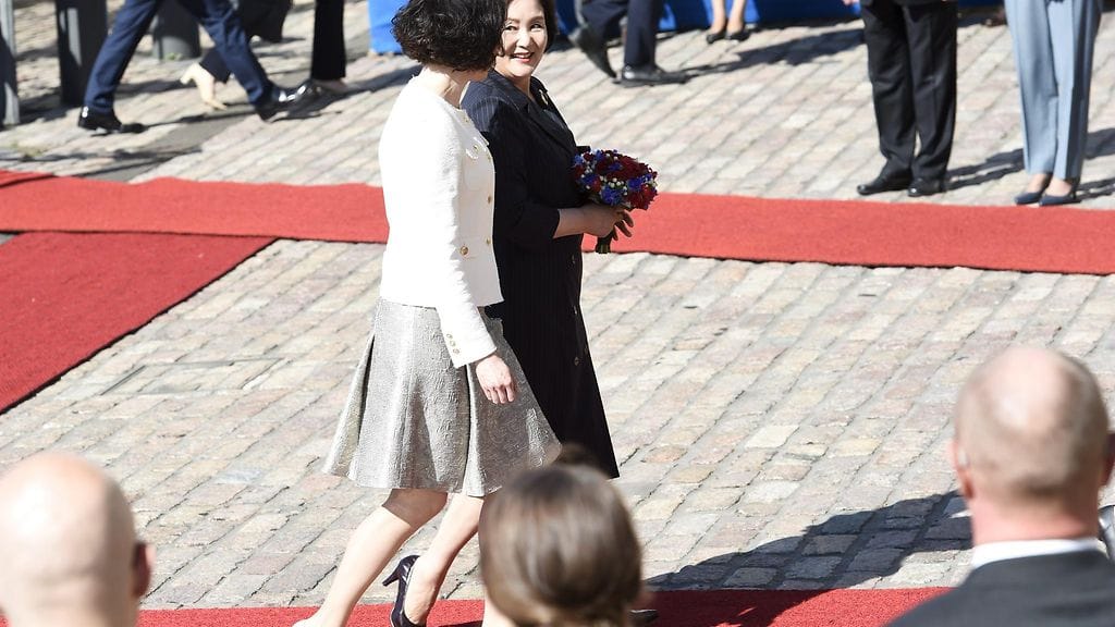 Etelä-Korean presidenttiparin valtiovierailu Suomessa alkoi tänään. Presidentinlinnalla heitä vastassa oli presidentti Sauli Niinistö ja rouva Jenni Haukio. Presidenttien kohtaamisessa huomio kiinnittyi erityisesti Haukion säkenöivään asuun.