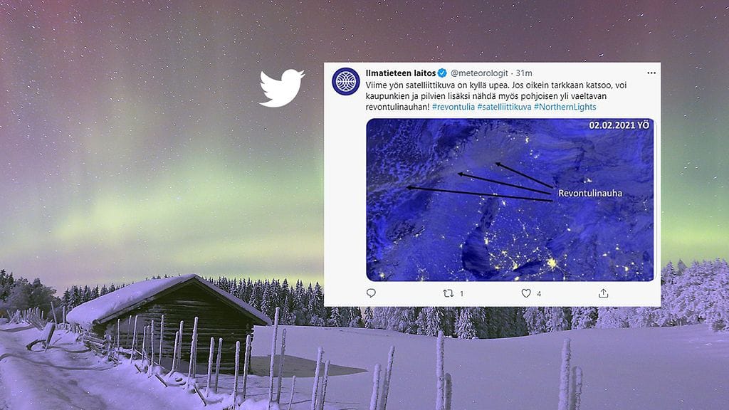 Katso upea kuva revontulinauhasta alla olevasta tviitistä! Juttu jatkuu tviitin jälkeen. Jos tviitti ei näy, voit katsoa sen tästä.