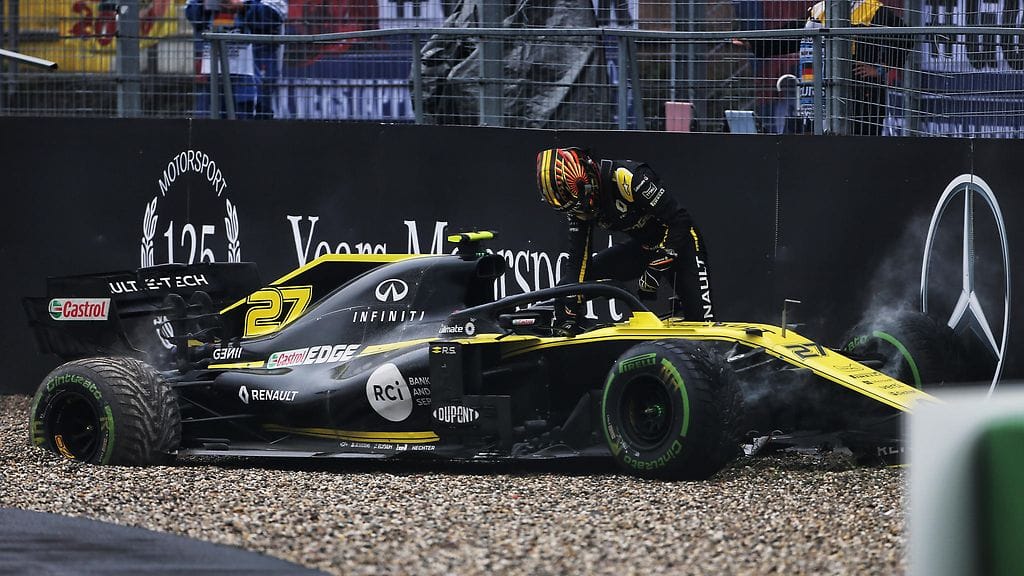Renaultin Nico Hülkenberg taisteli turva-autojen ja sääolojen ansiosta parhaimmillaan jopa Saksan GP:n palkintosijasta, mutta joutui keskeyttämään ajovirheensä seurauksena.