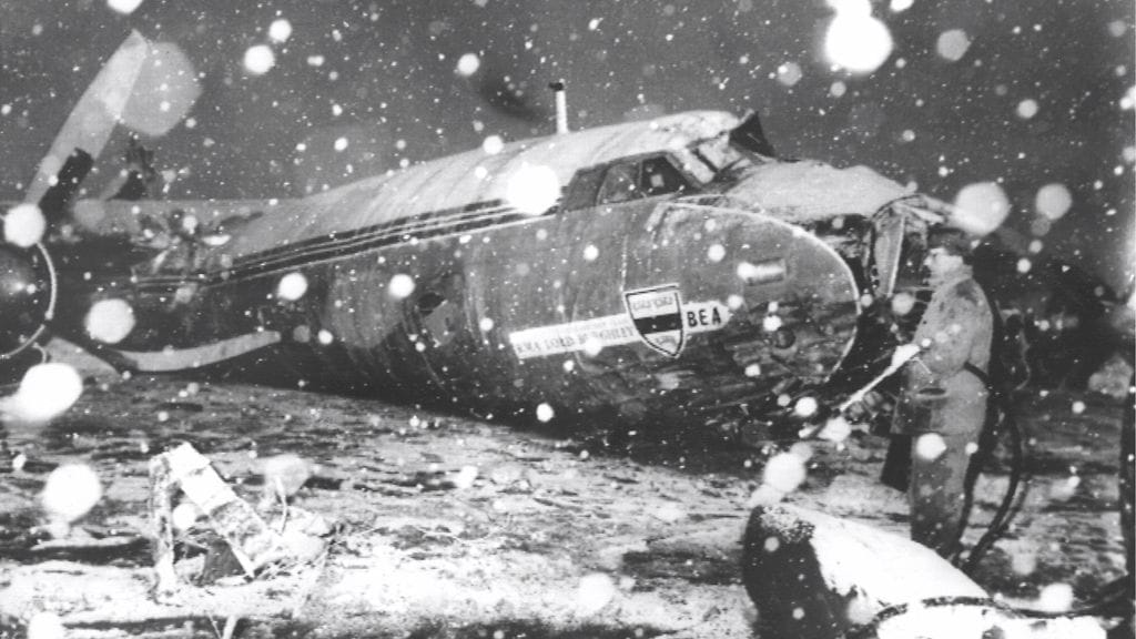 Tuolloin jalkapallon suurseura Manchester United oli matkalla kotiin pelattuaan Euroopan-cupissa Belgradin Punaista tähteä vastaan Jugoslaviassa. Kone teki välitankkauksen takia välilaskun Münchenissä, eikä päässyt loskaiselta kentältä ilmaan. Kolmannella nousuyrityksellä kone murskautui syöksyttyään kiitoradan päässä olevan aidan läpi ja osuttuaan rakennukseen.