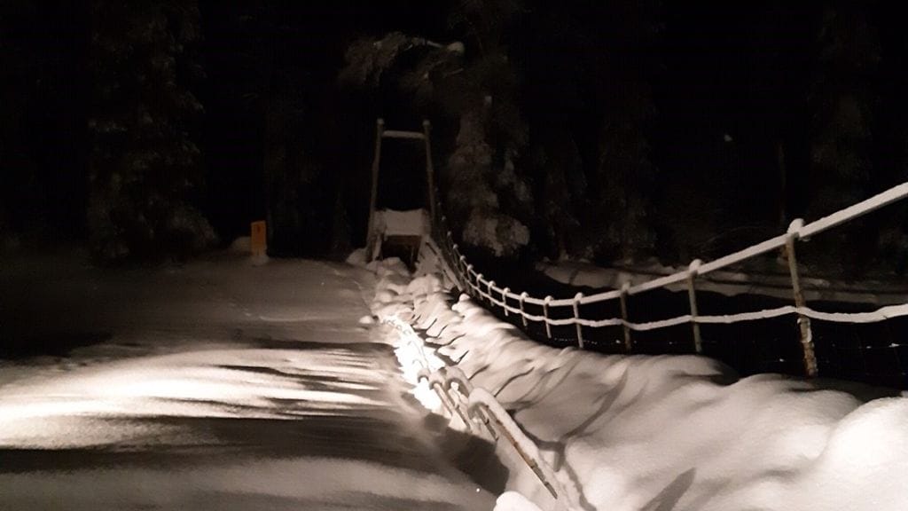 Nuorttijoen ylittävä Kolsankosken riippusilta Urho Kekkosen kansallispuistossa romahti lumen painon alla, kertoo Metsähallitus.