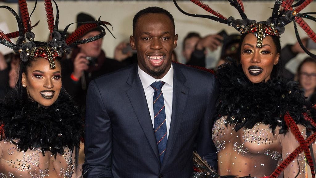 Punaiselle matolle juhlan tuntua toi spandex-asuihin ja näyttäviin höyhenkauluksiin pukeutuneet kaunottaret, joiden kanssa Bolt poseeraa varsin iloisen oloisena.