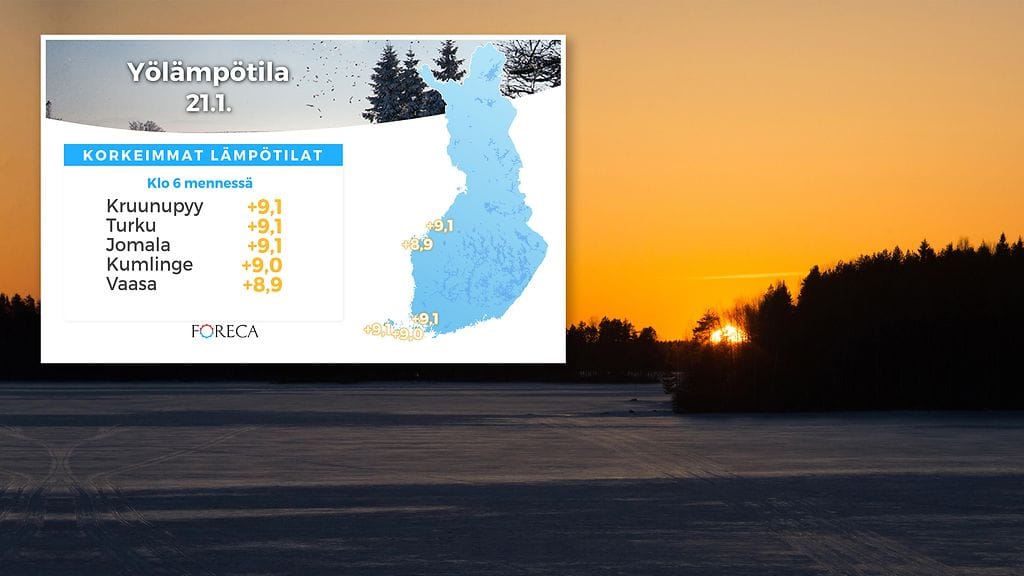 Föhn-tuulen vuoksi yön korkeimmat lämpötilat mitattiin Kruunupyyssä, Turussa ja Jomalassa, joissa kaikissa oli 9,1 astetta lämmintä.