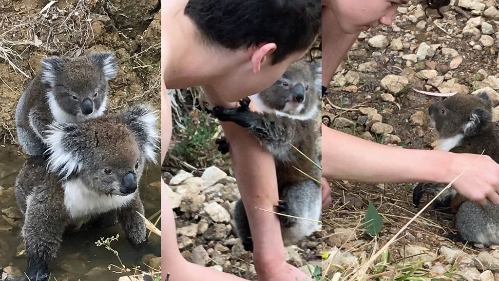 Äidin ja pojan patikkaretki sai huikean käänteen Etelä-Austaliassa, kun pienenpieni, utelias koalanpoikanen tykästyi ihmisiin ja tuli tekemään tuttavuutta.