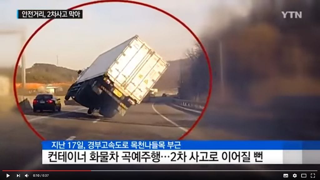 Etelä-Koreassa kuvatulla videolla nähdään, kuinka kuorma-auton kuljettaja on vähällä menettää ajoneuvonsa hallinnan moottoritiellä.