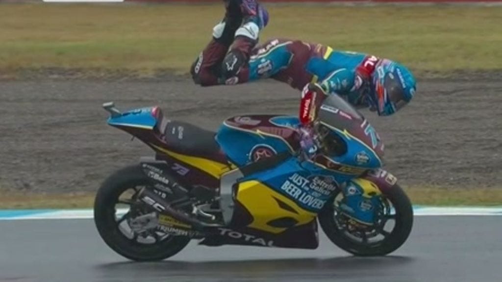 Marquez lensi pyöränsä selästä, mutta espanjalainen ei irrottanut otettaan ohjaustangosta. Kuin ihmeen kaupalla Marquez onnistui pitämään pyöränsä pystyssä ja jatkamaan matkaa, vaikka hetken ajan espanjalaisen jalat osoittivatkin kohti taivasta.