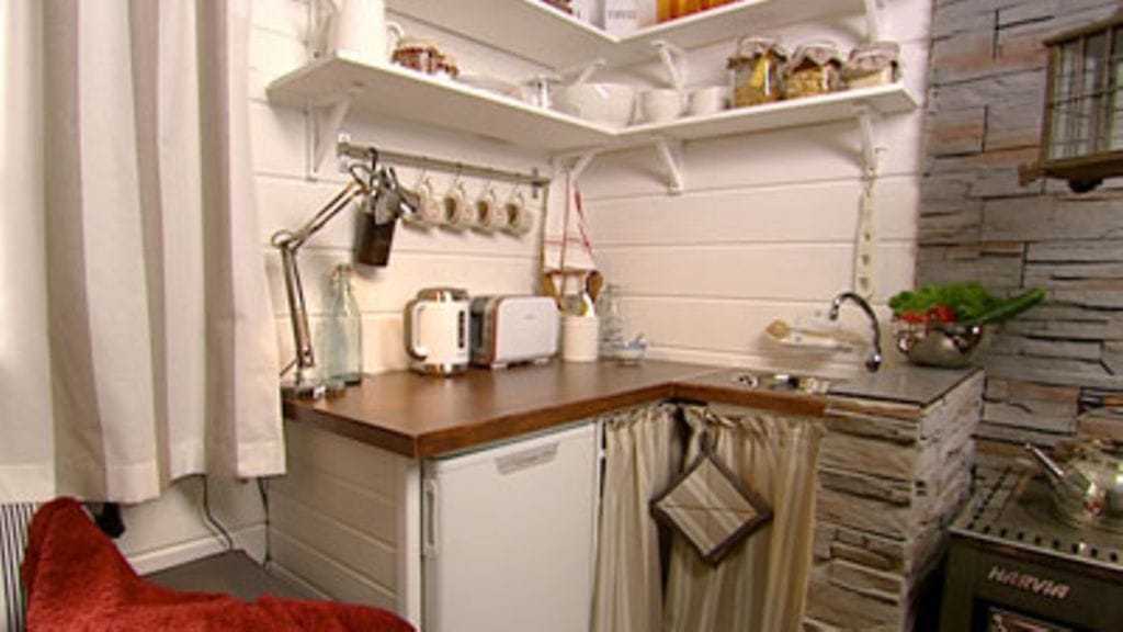 Työtasojen alla on pieni jääkaappipakastin ja verhojen taakse piiloon jäävät roskikset sekä säilytystilaa. Tasojen yläpuolelle haluttiin laittaa vain kevyitä hyllyjä ja niille tarpeelliset astiat ja kuivaruokatarvikkeet. Tiskaus tapahtuu ulkona, joten lampuksi voitiin valita ihan tavallinen työvalaisin.
