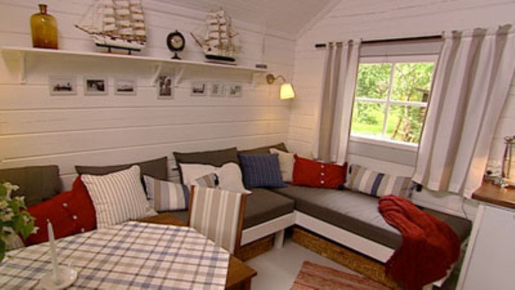 Vaikka mökki hohkaa vielä uutuuttaan ja maali tuoksuu nenään, sinne on tuotu monia rakkaita muistoja ja esineitä. Punaiset räsymatot ovat mummun vanhaan mökkiin teettämät ja laivat muistuttavat toisen papan Suomen Joutsenella tekemistä maailmanympäripurjehduksista. Hyllyjen alle seinälle teetettiin ja kehystettiin värivalokuvista mustavalkoisia kuvia muistuttamaan perheen yhteisistä mökkipuuhista.
