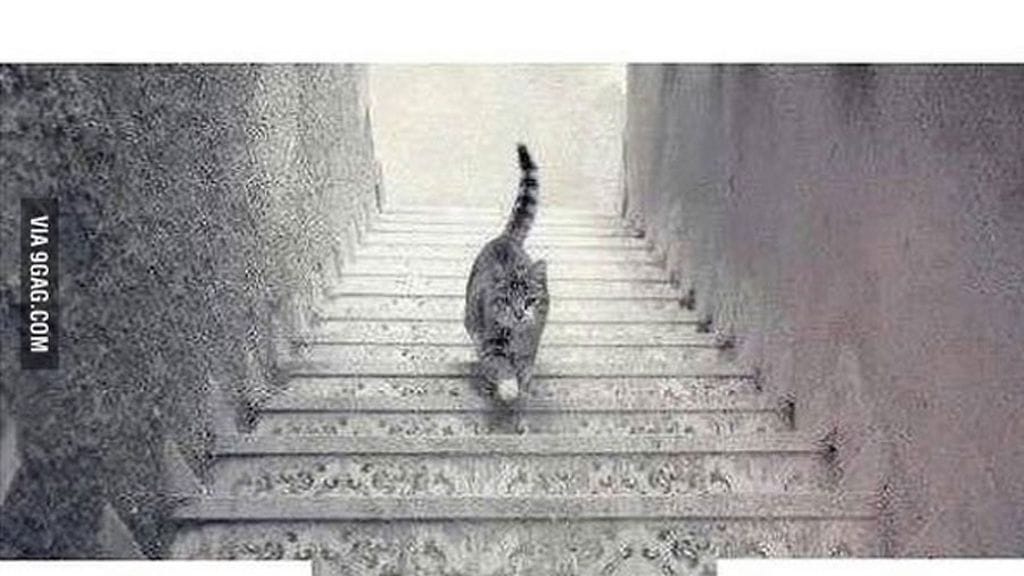 Somessa leviää nyt 9gag-sivustolle alunperin ladattu kuva portaita astelevasta kissasta, mutta meneekö kissa ylös vai alas?