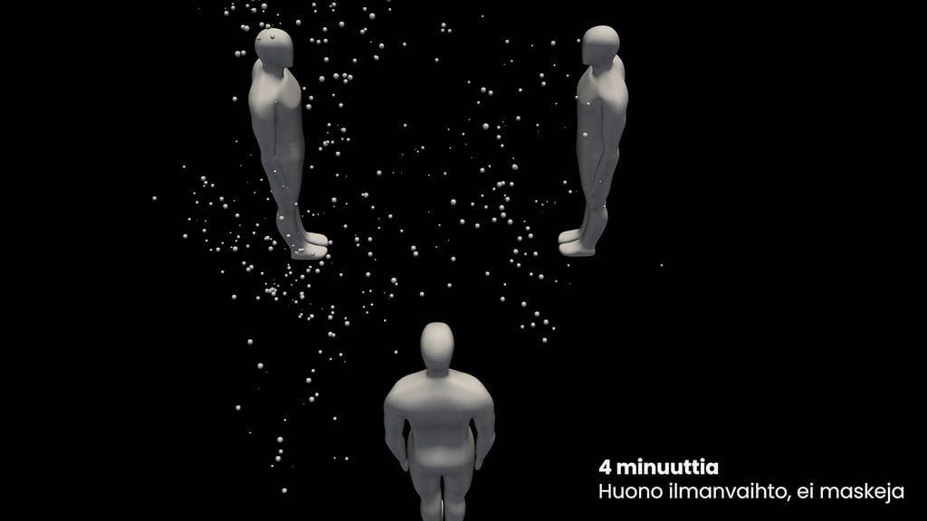 Mallinnus näyttää, miten ihminen tuottaa pisaroita ja aerosoleja ja millainen merkitys ilmanvaihdolla on aerosolin säilymiseen sisäilmassa.