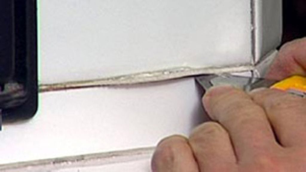 Tällä kertaa puhdistettavaksi tuli kaakeliuuni, joka on saumattu elastisella saumamassalla. Sillä on varmaankin pyritty eliminoimaan halkeilua, jota saattaisi aiheutua uunin laajenemisesta ja kutistumisesta. Aine leikattiin pois mattoveitsellä. Jos saumat on tehty perinteiseen tapaan kovalla sauma-aineella, puhdistamiseen käytetään erityistä saumaraspia, jolla aine raaputetaan pois. Sellaisen kanssa tulee olla tarkkana, ettei vahingoita kaakelin reunoja. Se jää helposti näkymään.