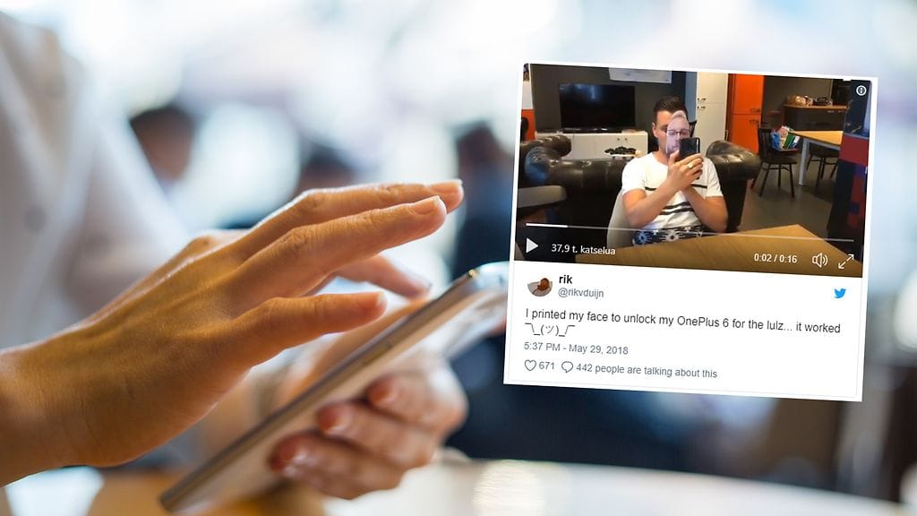 Twitter-käyttäjä rikvduijn väittää, että vasta julkaistun OnePlus 6 -puhelimen kasvojentunnistuksen voi avata pelkästään näyttämällä kuvaa laitteen omistajasta. Väitteensä tueksi mies on jakanut Twitteriin videon, jossa hän tekee näin.