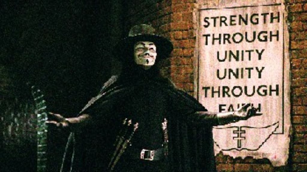 Hollywoodin sarjakuvafilmatisoinnit jatkuvat DC Comicsin Guy Fawkes –naamarissa keikaroivan V:n kostokertomuksella. V niin kuin verikosto on aikuisten dystopiasatu, jossa ennustellaan totalitarismia ja vannotaan vapauden, vigilantismin ja väkivallan nimiin.
