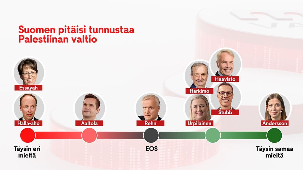 Suomen presidenttiehdokkaista monet olisivat valmiit Palestiinan tunnustamaan. Li Andersson (vas.) on tunnustamisesta täysin samaa mieltä. Pekka Haavisto (valitsijayhdistys), Alexander Stubb (kok.), Jutta Urpilainen (sd.) ja (liik.) ovat tästä jokseenkin samaa mieltä.