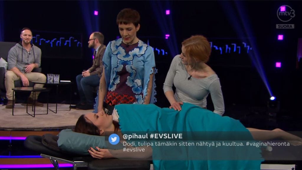 Nainen nimittäin haastatteli suorassa lähetyksessä lantionpohjan lihashuoltaja Saana Valkamaa sekä hierottavana lähetyksessä ollutta bloggaaja Nanna Vallia.