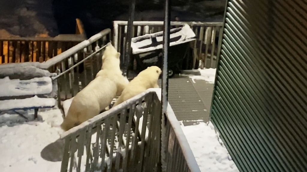 Katso ylhäällä olevalta videolta, miten jääkarhuemo ja poikanen nuuhkivat piha-alueen läpi!