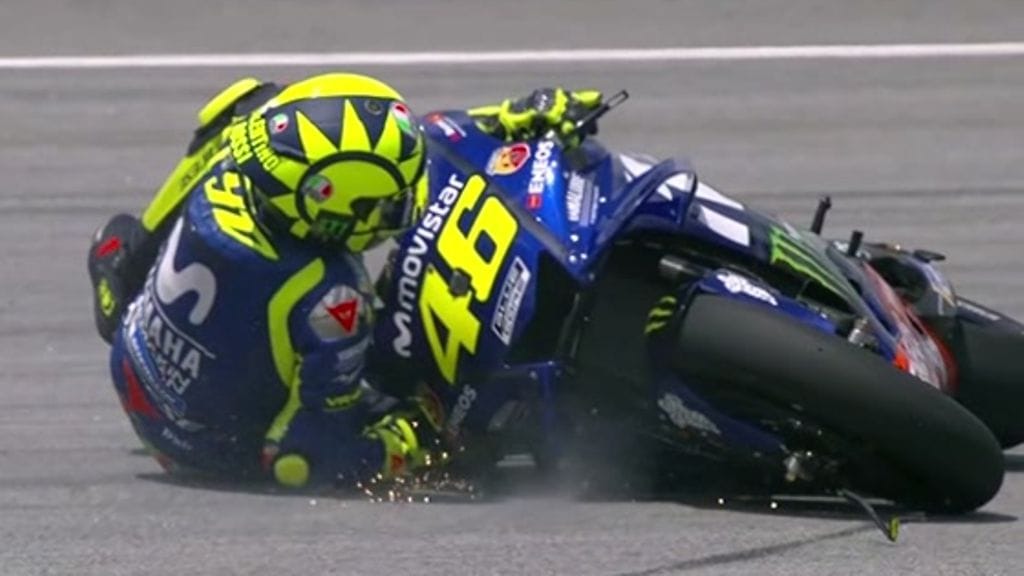 Katastrofi iski neljä kierrosta ennen maalia, kun Rossi kaatui Sepangin radan avausmutkassa. Alle sekunnin päässä Rossia hiillostanut Marquez kiitti ja ajoi jälleen kerran voittoon.