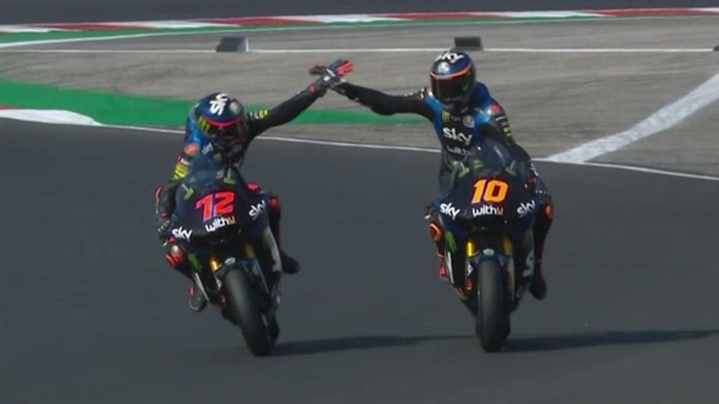 Ratamoottoripyöräilylegenda Valentino Rossin omistaman SKY Racing Team VR46 -tallin kuljettajat Luca Marini ja Marco Bezzecchi olivat omaa luokkaansa Riminin osakilpailun aika-ajoissa. Marini kukisti tallikaverinsa vain 0,036 sekunnin turvin. Paalupaikka on Marinin kauden toinen.