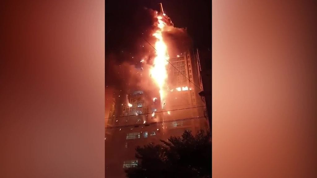 Valtava pilvenpiirtäjä on ilmiliekeissä eteläkorealaiskaupungissa.