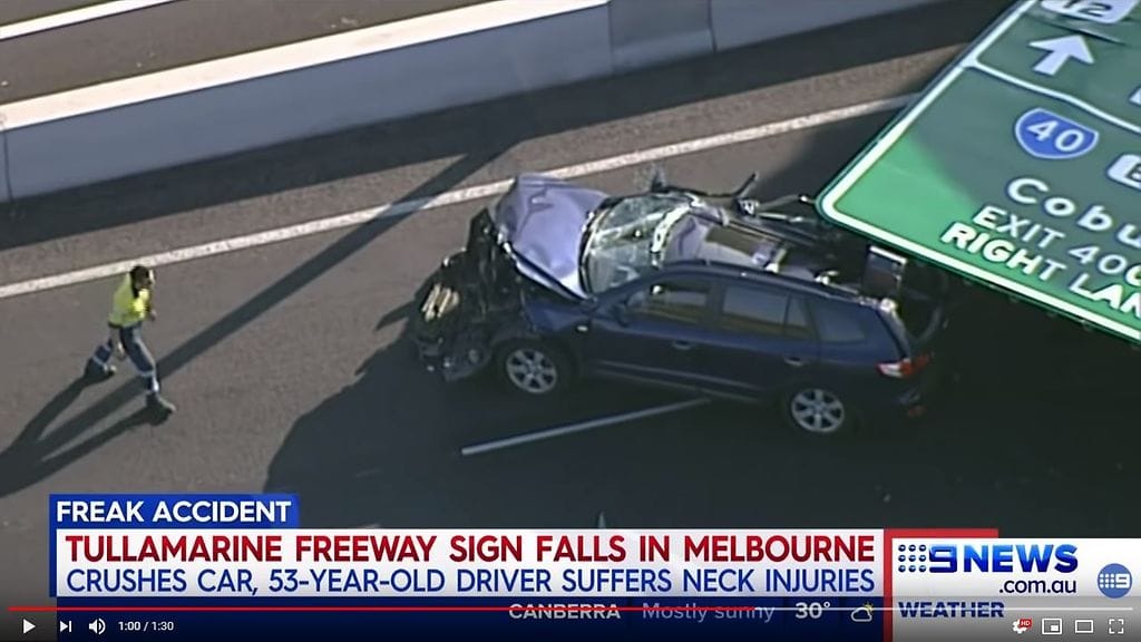 Videolla näkyy, miten tieopaste heilahtaa irti kiinnityksistään ja tippuu ensiksi 53-vuotiaan naiskuljettajan auton eteen, mutta kaatuu sitten rysähtäen naisen auton päälle. Kyltin metalliosat runnovat pahiten auton oikean puolen, mutta koska australialaisissa autoissa kuskin paikka on nimenomaan oikealla, kuskin vammat olisivat voineet olla hengenvaaralliset.