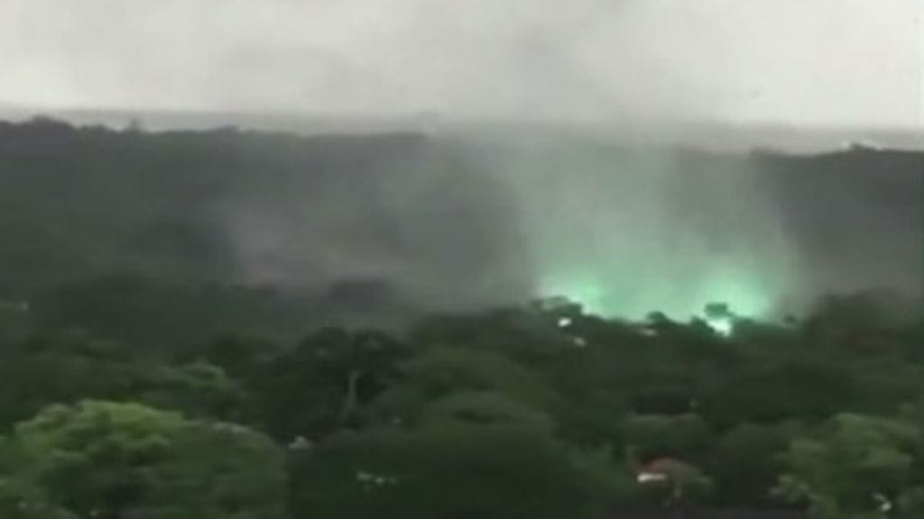 Puut lentelevät videolla, kun suuri tornado kulkee Orlandon keskustan liepeillä. Tornado katkoo matkallaan sähkölinjoja aiheuttaen valtavan vihreän välähdyksen.