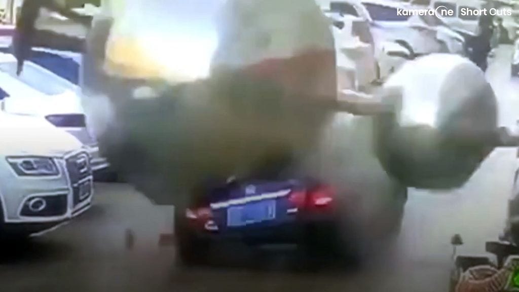 Kiinalaisautoilija oli päästä hengestään, kun suurikokoinen metallihäkkyrä, ilmeisesti jonkinlainen ukkosenjohdatin, irtosi tuulen voimasta talon katolta ja putosi suoraan hänen autonsa päälle.