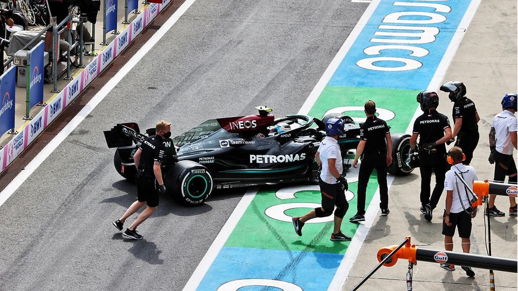 Bottas lähti vauhdilla liikkeelle renkaidenvaihdon jälkeen, mutta pyörähti poikittain heti varikkosuoralle palattuaan.