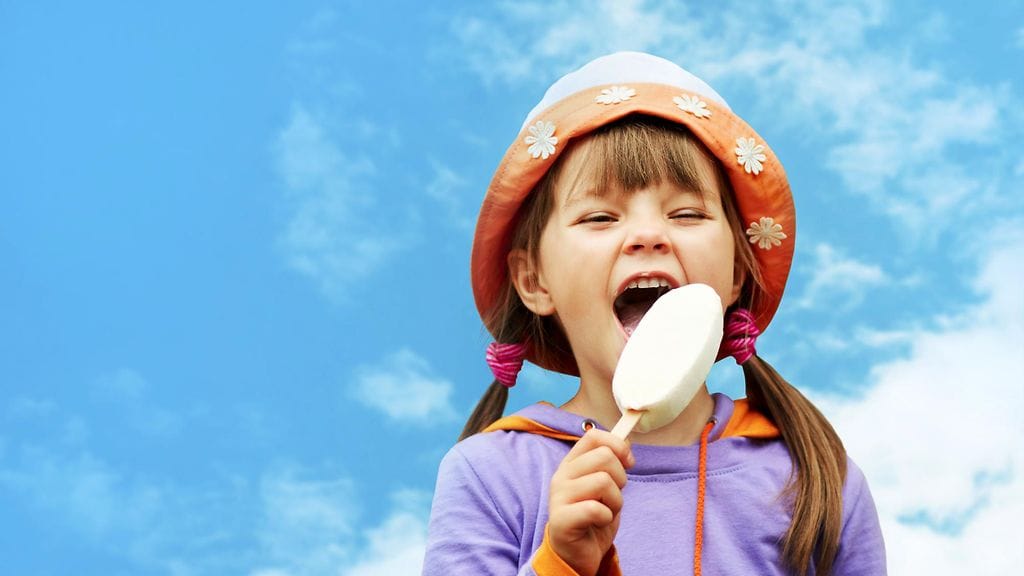 Aikuisilla jäätelön syöminen on jo hallussa mutta lapsilla aina ei ja jäätelö valuukin helposti sormille.
