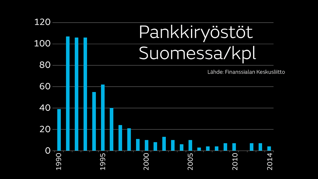 Pankkien turvallisuustilanne on kohentunut roimasti 90-luvun alkuvuosista. 1991, 1992, 1993 pankkiryöstöjä tehtailtiin yli 100 kappaletta vuodessa. Pankkiryöstössä jopa menehtyi yksi pankkivirkailija ja yksi sivullinen. Sitten turvallisuutta parannettiin ja ryöstöjen määrä saatiin pudottettua.