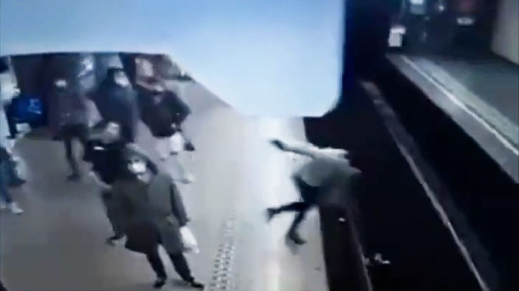 Nainen lentää raiteille ja juuri kun hän nostaa päätään rojahdettuaan maahan, metron voi nähdä saapuvan.