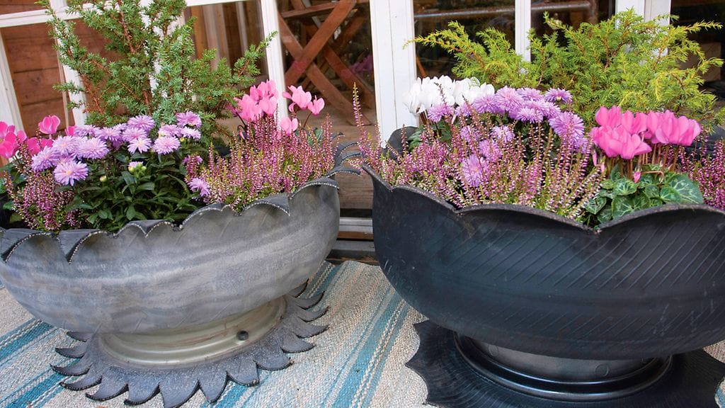 Yksi vinkeistä kertoo, kuinka vanhasta autonrenkaasta saa tehtyä näyttävän kumivaasin, jota voi käyttää esimerkiksi isona kukkaruukkuna.