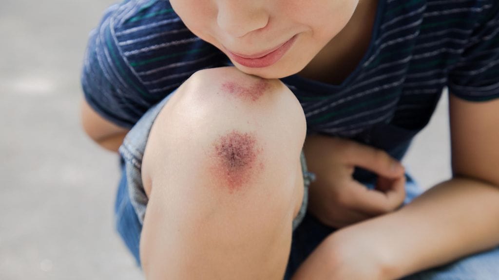Eemeli on saanut harvoin verta vuotavia haavoja, enemmän mustelmia, jollainen on nytkin polvessa.