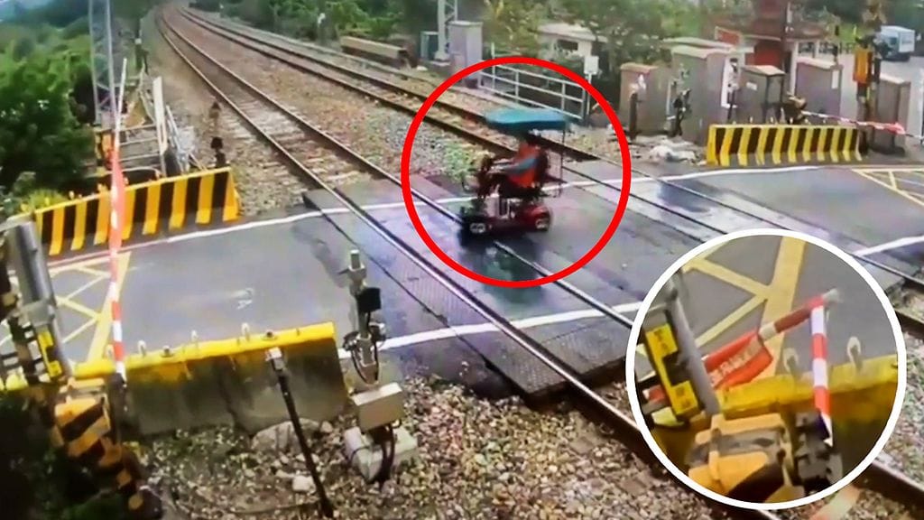 Yllä nähtävällä videolla voi nähdä miten taiwanilainen vanhus alittaa täpärästi junanraiteiden poikki laskeutuvan puomin ja jää kahden laskeutuneen puomin väliin sähkömopollaan.