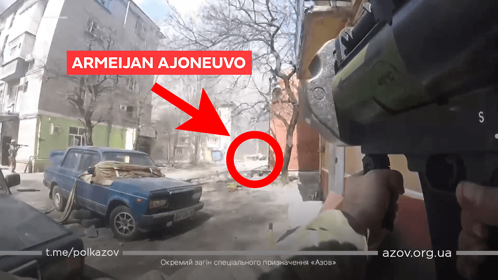 19. huhtikuuta jaetulla videolla näkyy, kuinka sotilas tulittaa venäläistä ajoneuvoa. Video on peräisin Azovin pataljoonan Telegram-tililtä.