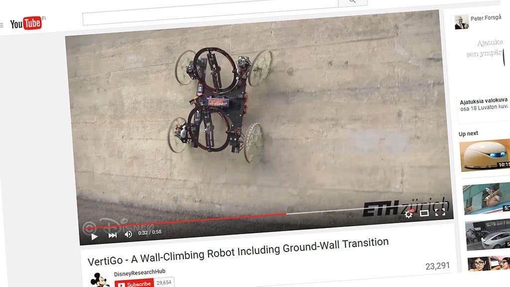 Disneyn Zürichin tutkimuskeskuksen ja teknillisen korkeakoulun ETH:n suunnittelema VertiGo-robottiauto pystyy siirtymään maasta suoraan seinälle ja ajamaan sillä. Kallistuvat propellit mahdollistavat seinillä ajamisen, eikä auto tipu sieltä alas.