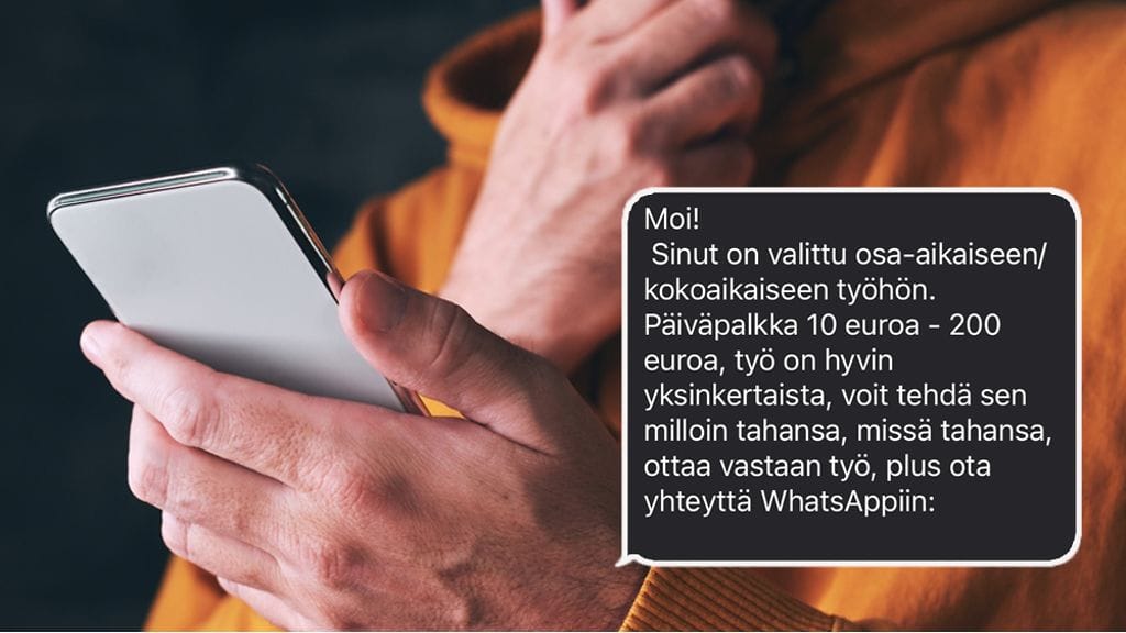 – Moi! Sinut on valittu osa-aikaiseen/kokoaikaiseen työhön. Päiväpalkka 10 euroa – 200 euroa, työ hyvin yksinkertaista, voit tehdä sen milloin tahansa, missä tahansa, ottaa vastaan työ, plus ota yhteyttä WhatsAppiin: 35841477****, viestissä lukee sanatarkasti.