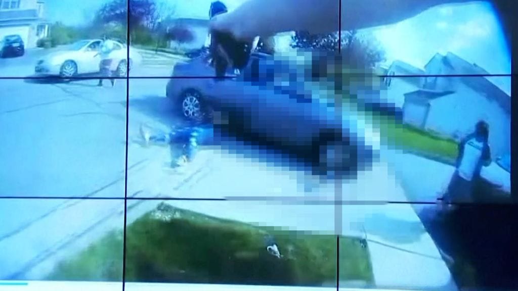 Videolla näkyy, kuinka asetta käyttänyt poliisi saapuu kodin pihalle keskelle kaoottista tilannetta. Paikalla on useita ihmisiä, mukaan lukien Bryant veitsen kanssa.
