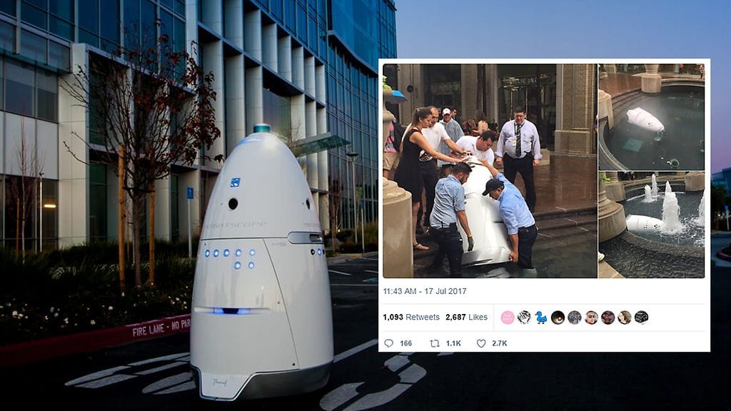 Vartijarobotille sattui työtapaturma Washingtonissa Yhdysvalloissa, kun se oli partioimassa toimistorakennuksessa. Rakennuksen aulassa sijaitsevan suihkulähdettä reunustava askelma olikin Knightscope K5 -merkkiselle robotille liian vaikea este ylitettäväksi.