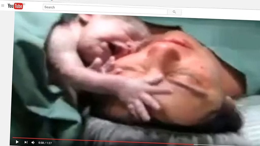 Näin kommentoidaan synnytysvideota vuodelta 2014. Videolla keisarileikkauksella syntynyt vauva tuodaan äitinsä kasvojen lähelle. Itkevä vauva rauhoittuu saadessaan koskea äitinsä ihoa; kun hoitaja siirtää lasta, tämä alkaa itkeä.