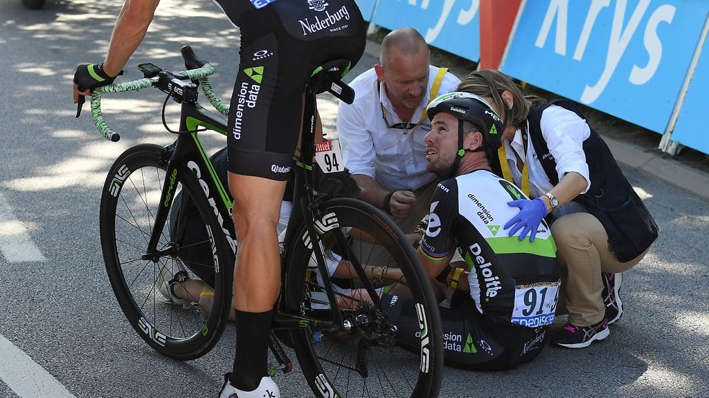 Eilen kilpakumppani Peter Saganin törkeän töytäisyn vuoksi päin aitaa kaatunut Mark Cavendish joutuu jättämänä Ranskan ympäriajon kesken.