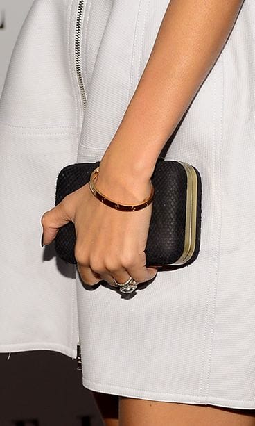 Sähäkän mekkonsa seuraksi Richie oli valinnut räväkät asusteet: niitein koristellut kengät, massiivinen sormus, musta kynsilakka ja näppärä clutch-laukku toimivat hänen klassisen ja tyylikkään asukokonaisuutensa kruununa.
