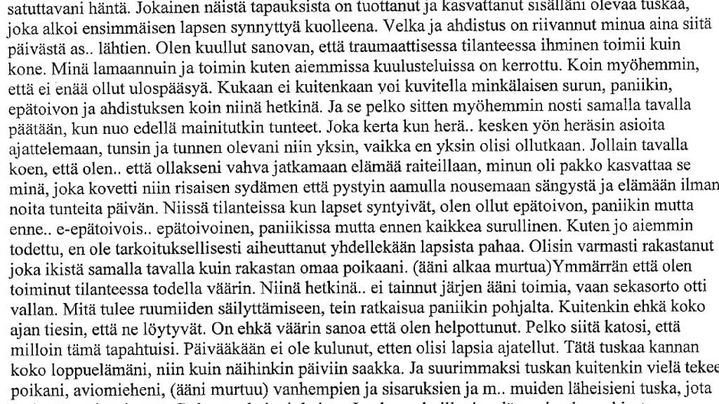 En voi kuvitellakaan mitä läheiseni, sukulaiseni sekä ystävät tuntevat tällä hetkellä. Yritän pukea sanoiksi tunteeni viimeisen vuosikymmenen ajalta. Kuten tiedetään, minulla on lapsi. Xx (lapsen nimi) on minulle rakkain ja kallein asia, mitä maa päällään kantaa. En koskaan voisi kuvitella satuttavani häntä. Jokainen näistä tapauksista on tuottanut ja kasvattanut sisälläni olevaa tuskaa, joka alkoi ensimmäisen lapsen synnyttyä kuolleena. Velka ja ahdistus on riivannut minua aina siitä päivästä lähtien. Olen kuullut sanovan, että traumaattisessa tilanteessa ihminen toimii kuin kone. Minä lamaannuin ja toimin kuten aiemmissa kuulusteluissa on kerrottu. Koin myöhemmin, että ei enää ollut ulospääsyä. Kukaan ei kuitenkaan voi kuvitella minkälaisen surun, paniikin, epätoivon ja ahdistuksen koin niinä hetkinä. Ja se pelko sitten myöhemmin nosti samalla tavalla päätään., kun nuo edellä mainitutkin tunteet. Joka kerta kun kesken yön heräsin asioita ajattelemaan, tunsin ja tunnen olevani niin yksin, vaikka en yksin olisi ollutkaan. Jollain tavalla koen, että olen ollakseni vahva jatkamaan elämää raiteillaan, minun oli pakko kasvattaa se minä, joka kovetti niin risaisen sydämen että pystyin aamulla nousemaan sängystä ja elämään ilman noita tunteita päivän. Niissä tilanteissa kun lapset syntyivät, olen ollut epätoivon, paniikin mutta epätoivoinen, paniikissa mutta ennen kaikkea surullinen. Kuten jo aiemmin todettu, en ole tarkoituksellisesti aiheuttanut yhdellekään lapsista pahaa. Olisin varmasti rakastanut joka ikistä samalla tavalla kuin rakastan omaa poikaani. Ymmärrän että olen toiminut tilanteessa todella väärin. Niinä hetkinä ei tainnut järjen ääni toimia, vaan sekasorto otti vallan. Mitä tulee ruumiiden löytymiseen, tein ratkaisun paniikin pohjalta. Kuitenkin ehkä koko ajan tiesin, että ne löytyvät. On ehkä väärin sanoa että ole helpottunut. Pelko siitä katosi, että milloin tämä tapahtuisi. Päivääkään ei ole kulunut, etten olisi lapsia ajatellut. Tätä tuskaa kannan koko loppuelämäni, niin kuin näihinkin päiviin saakka. Ja suurimmaksi tuskan kuitenkin vielä tekee poikani, aviomieheni, vanhempien ja sisarusten ja muiden läheisteni tuska, jota he joutuvat kärsimään. Rakastan heitä jokaista. Ja olen pahoillani sydämeni pohjasta tuottamastani tuskasta. |