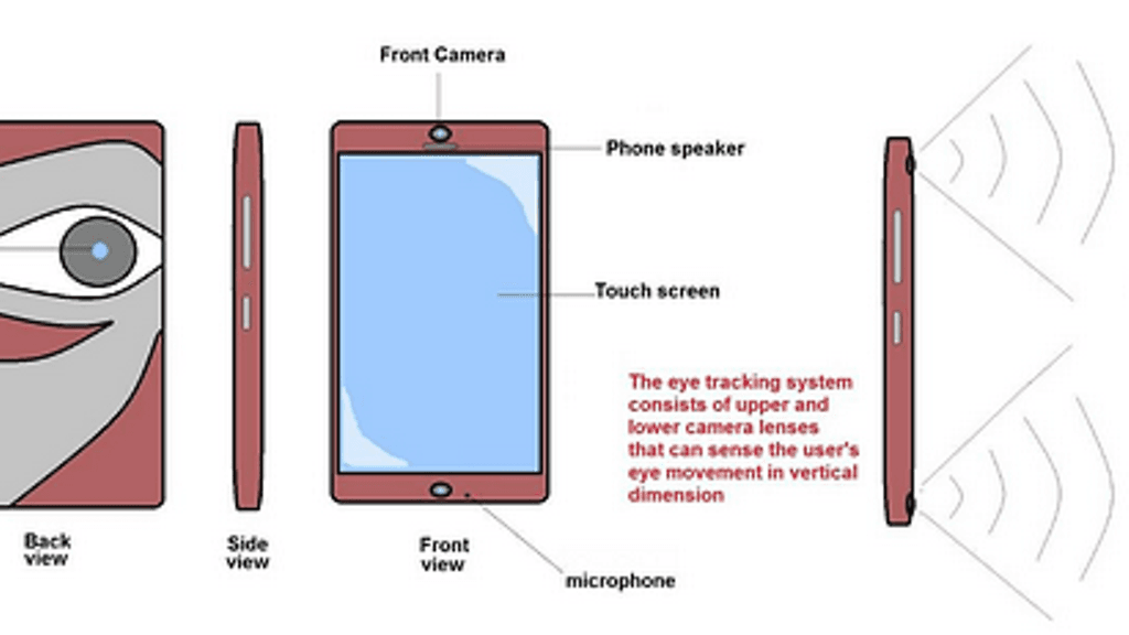 Idea numero 1572: Puhelin, joka havaitsee silmien katseen ja toimii sen perusteella. Puhelimen näytöllä näkyvää sisältöä voisi esimerkiksi selata katseella, minkä lisäksi voisi mukana olla myös silmäeletoimintoja. Lisäksi puhelimen taustalla olisi kiinnitysmateriaalia, jolla puhelin voisi kiinnittyä eri pintoihin.