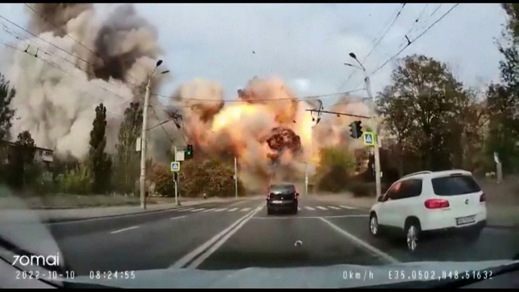 Venäjä iski maanantaina Ukrainan eri kaupunkeihin. Pääkaupunki Kiovan lisäksi iskut kohdistuivat muun muassa Dniproon. Yksi räjähdyksistä tallentui autoilijan kojelautakameraan.