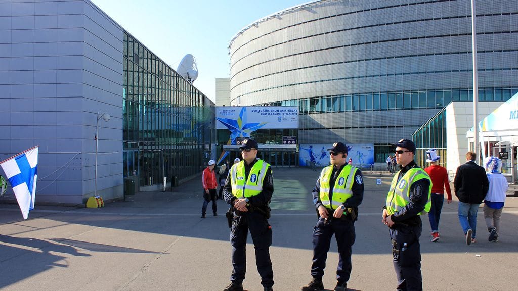 Poliisipartiot ovat olleet tuttu näky Hartwall Areenan pihalla MM-kisojen aikaan. Useita poliiseja päivysti Areenalla myös hyvissä ajoin jo ennen Suomi-Venäjä-ottelua.