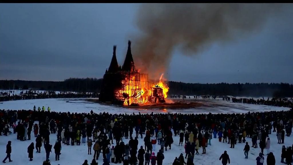 Moskovan lounaispuolella sijaitsevalla Kalugan alueella juhlittiin Maslenitsaa sankoin joukoin polttamalla 24-metrinen luonnomateriaaleista kasattu linna.