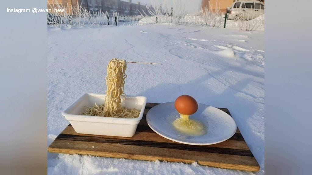 Kekseliäimmät ovat kuvanneet videolle pakkasen vaikutuksia. Yllä olevalta videolta näkyy, kuinka nuudeli ja kananmuna jäätyvät hetkessä hullunkurisiin asentoihin.